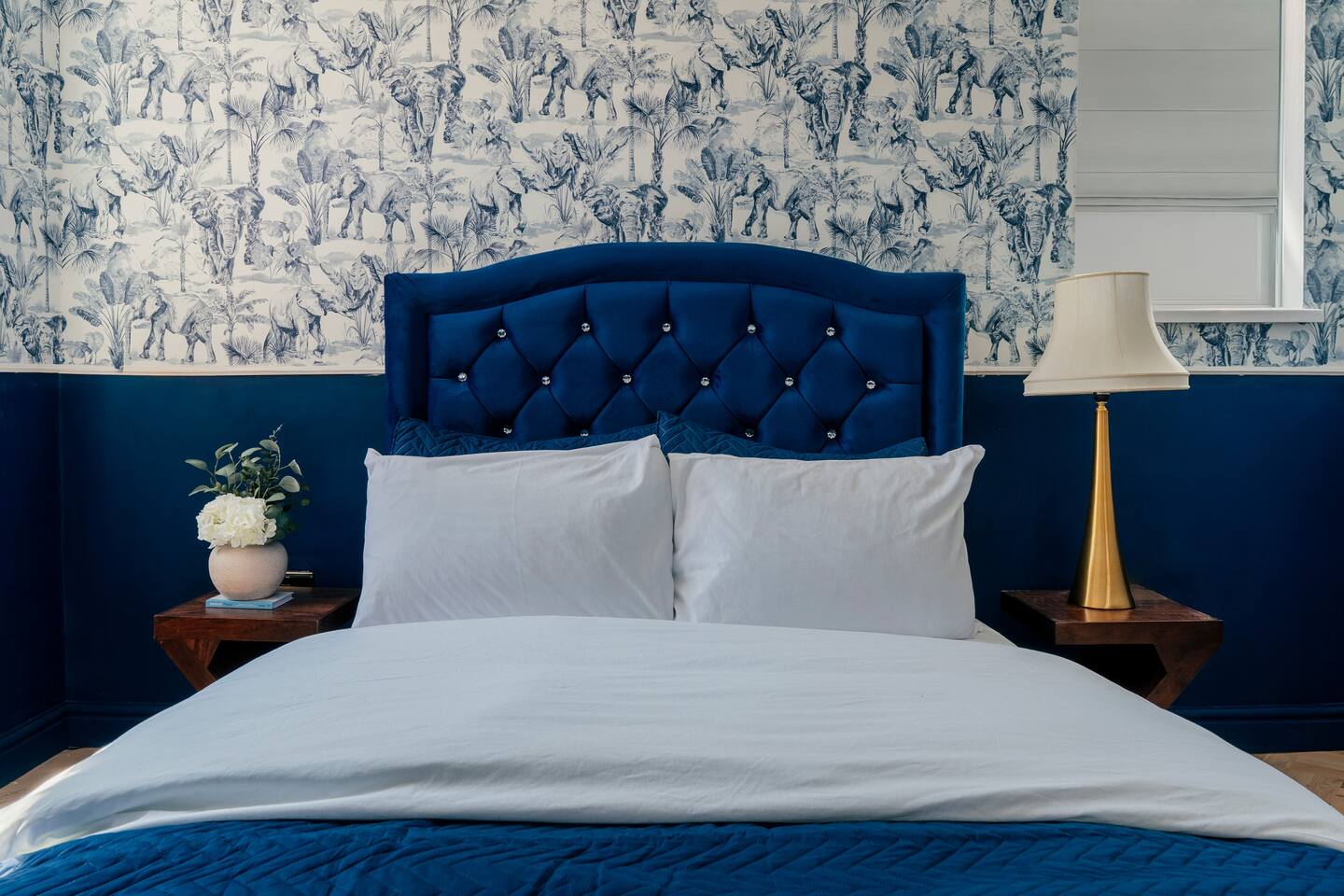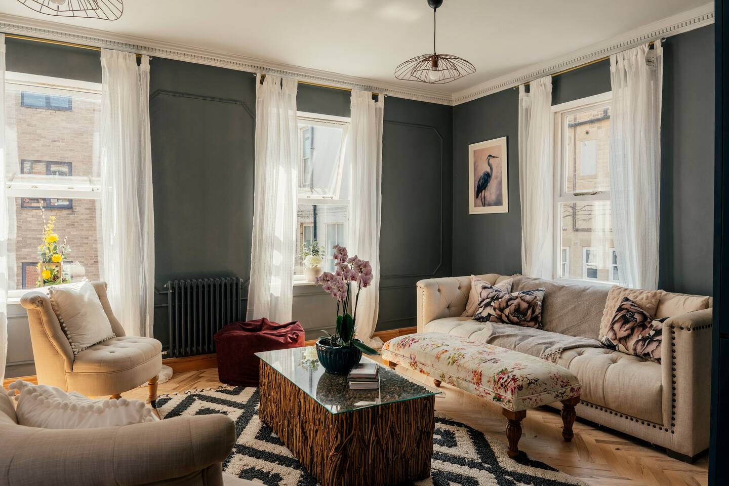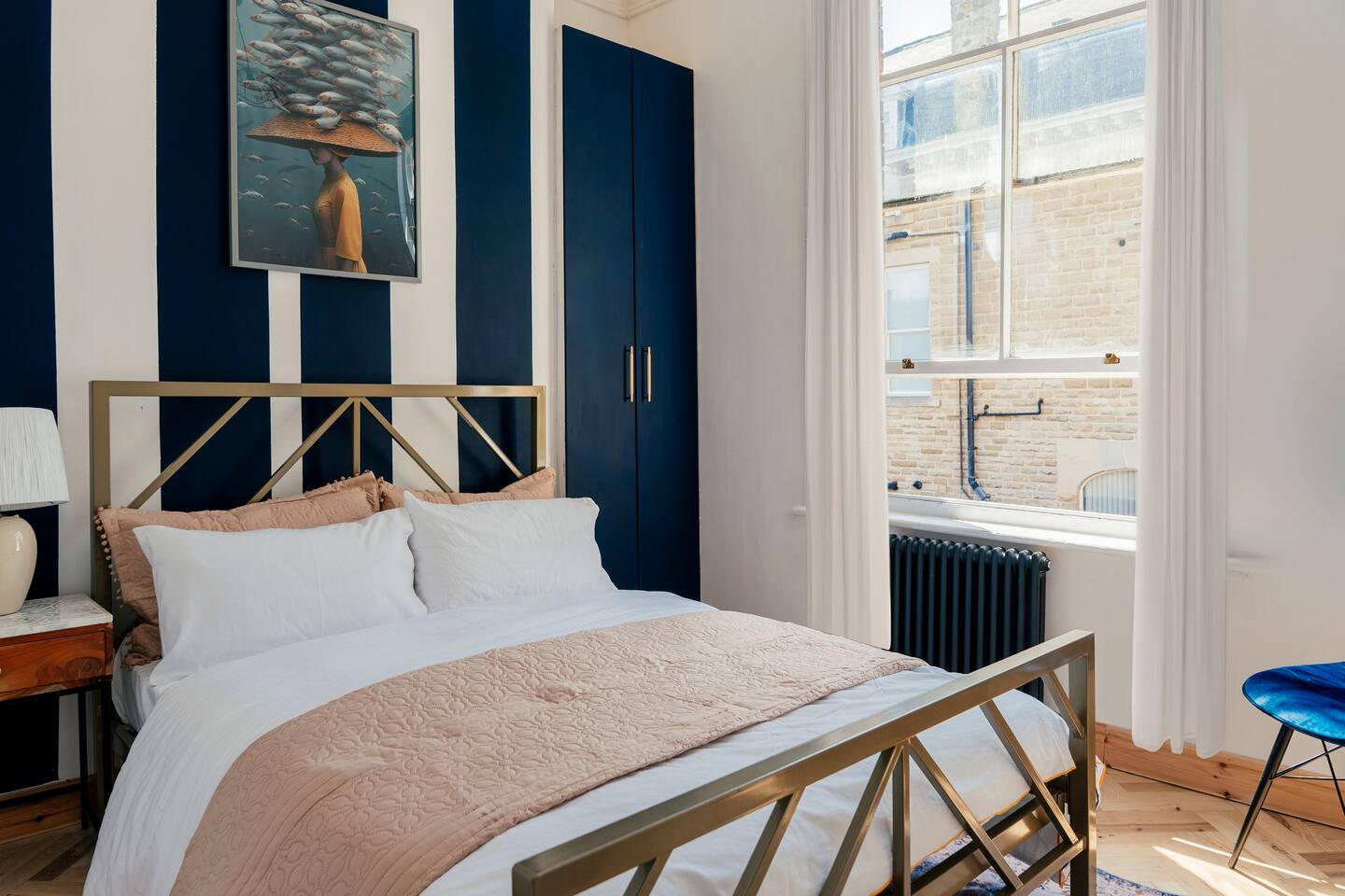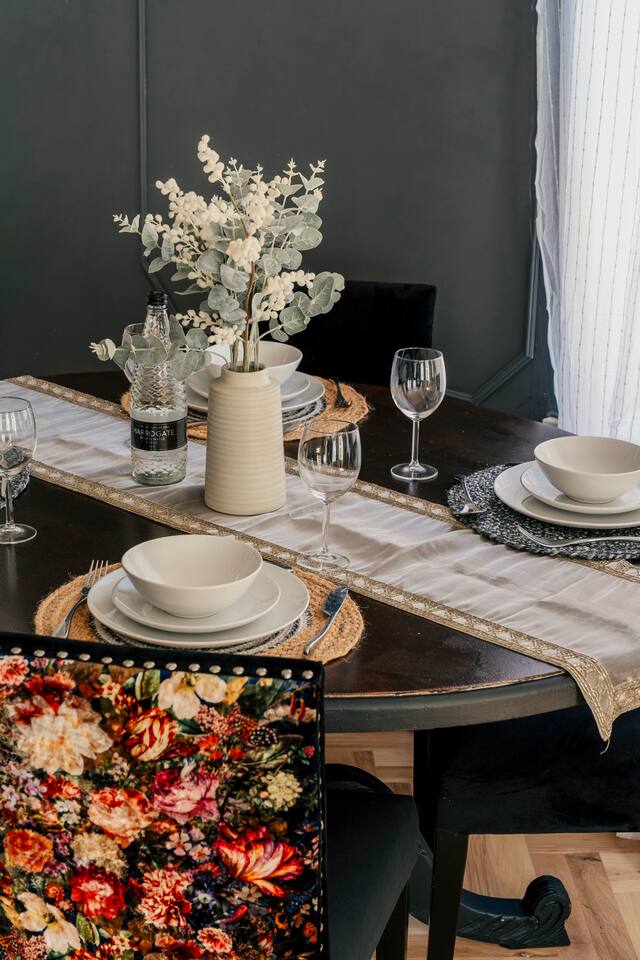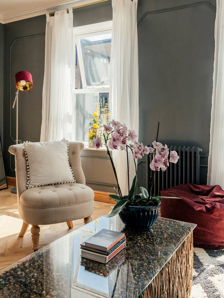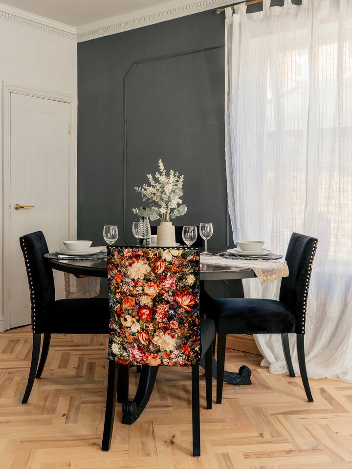 We are delighted to host you in our recently converted first floor apartment. The apartment has been designed with a large personality and your comfort at the forefront. The property boasts solid wood parquet flooring throughout, bold wallpaper and tiles and plenty of soft furnishings to make your stay cosy. 🧳 The Living, Dining & Kitchen Area: Featuring a large open plan area with beige linen sofa and chairs and 5 windows, the area feels very light and airy with plenty of space for socialising and unwinding after a long day. The living area features a 55" smart TV perfect for streaming your favourite shows. There are also humorous books to flick through and board games for your entertainment. 🛌 The Bedrooms: Each bedroom features beds with cotton Dusk bedlinen, extra pillows and oversized duvets making them more comfortable for sharing. Each room has it's own personality with bold designs and intriguing artwork. 🚿 The Bathroom: The blue theme continues in the large airy bathroom featuring a full sized shower, large window, hansgrohe integrated toilet and a vanity unit with mirror plus plenty of space to dress and undress in. The hardware is brass throughout which adds a touch of elegance and luxury. The ceilings are 3.5m high creating a very light and large feeling room. Other Key Facts: 🚗 Free parking 📍 5 minute walk into Harrogate's Town Centre 🍝 Close-by amazing restaurants 💼 Within walking distance to the Conference Centre 🏡 Located next to 9-5 offices.
