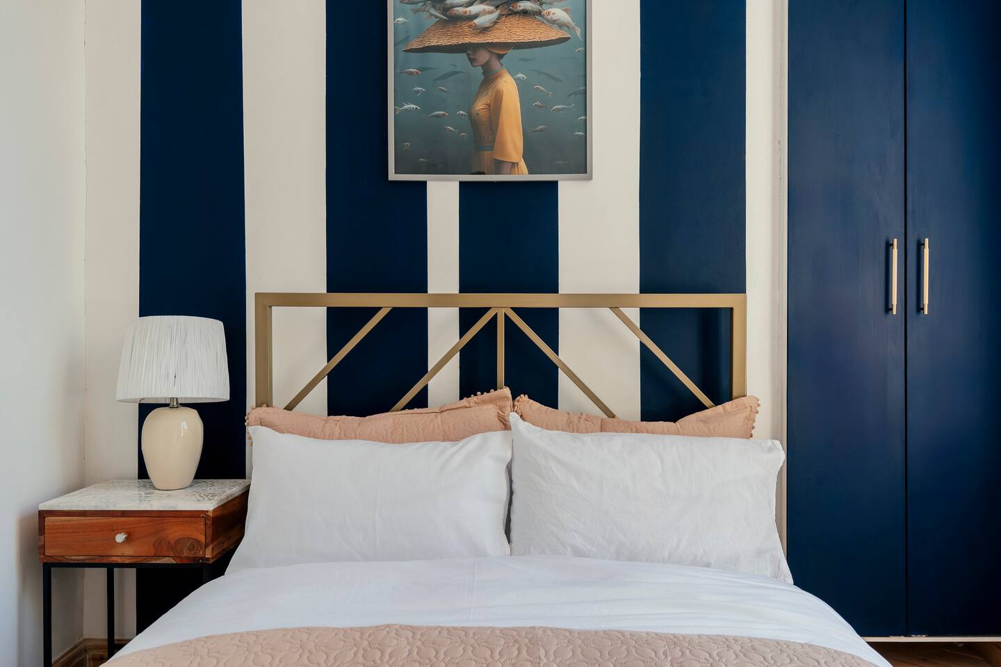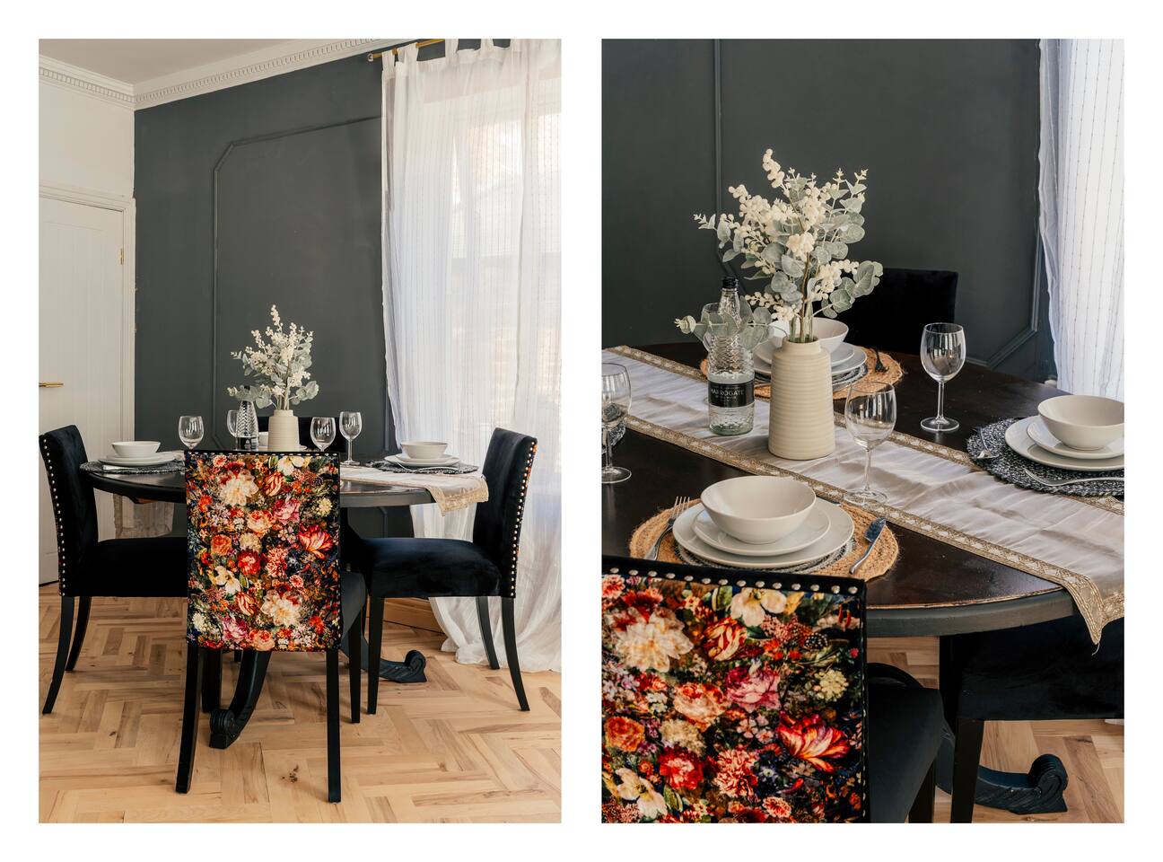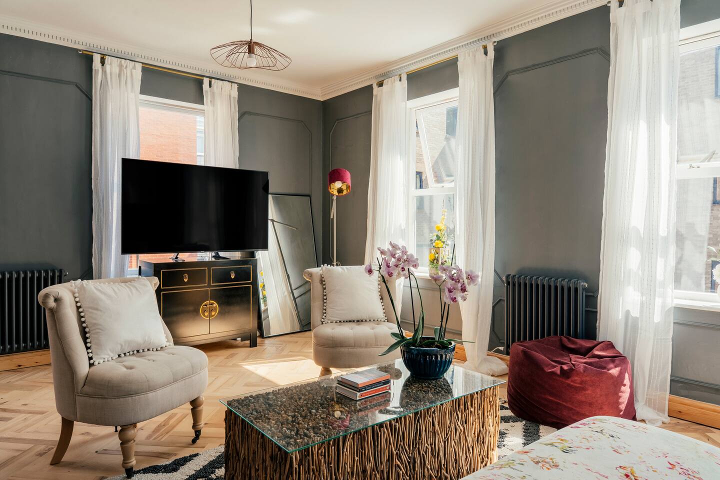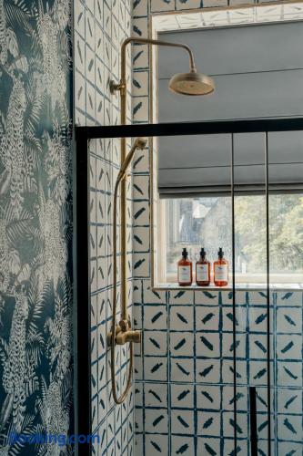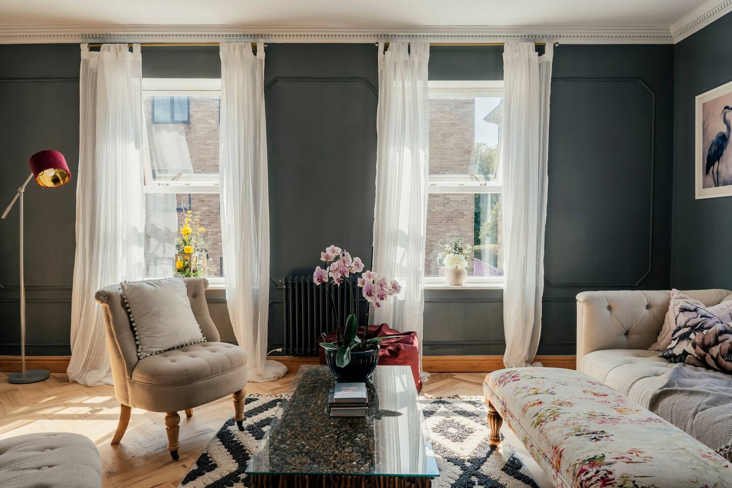 We are delighted to host you in our recently converted first floor apartment. The apartment has been designed with a large personality and your comfort at the forefront. The property boasts solid wood parquet flooring throughout, bold wallpaper and tiles and plenty of soft furnishings to make your stay cosy. 🧳 The Living, Dining & Kitchen Area: Featuring a large open plan area with beige linen sofa and chairs and 5 windows, the area feels very light and airy with plenty of space for socialising and unwinding after a long day. The living area features a 55" smart TV perfect for streaming your favourite shows. There are also humorous books to flick through and board games for your entertainment. 🛌 The Bedrooms: Each bedroom features beds with cotton Dusk bedlinen, extra pillows and oversized duvets making them more comfortable for sharing. Each room has it's own personality with bold designs and intriguing artwork. 🚿 The Bathroom: The blue theme continues in the large airy bathroom featuring a full sized shower, large window, hansgrohe integrated toilet and a vanity unit with mirror plus plenty of space to dress and undress in. The hardware is brass throughout which adds a touch of elegance and luxury. The ceilings are 3.5m high creating a very light and large feeling room. Other Key Facts: 🚗 Free parking 📍 5 minute walk into Harrogate's Town Centre 🍝 Close-by amazing restaurants 💼 Within walking distance to the Conference Centre 🏡 Located next to 9-5 offices.